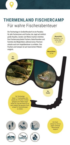 Die Teichanlage in Großwilfersdorf ist ein Paradies für alle Fischerinnen und Fischer, die Jagd auf wirklich große Karpfen, Zander und Welse machen möchten. Das Fischercamp bietet Fischern, Naturfreunden und Familien die Möglichkeit, während eines Thermenurlaubs auch ein Angelabenteuer zu erleben. Das Fischen und Campen ist auf reservierten Plätzen möglich.