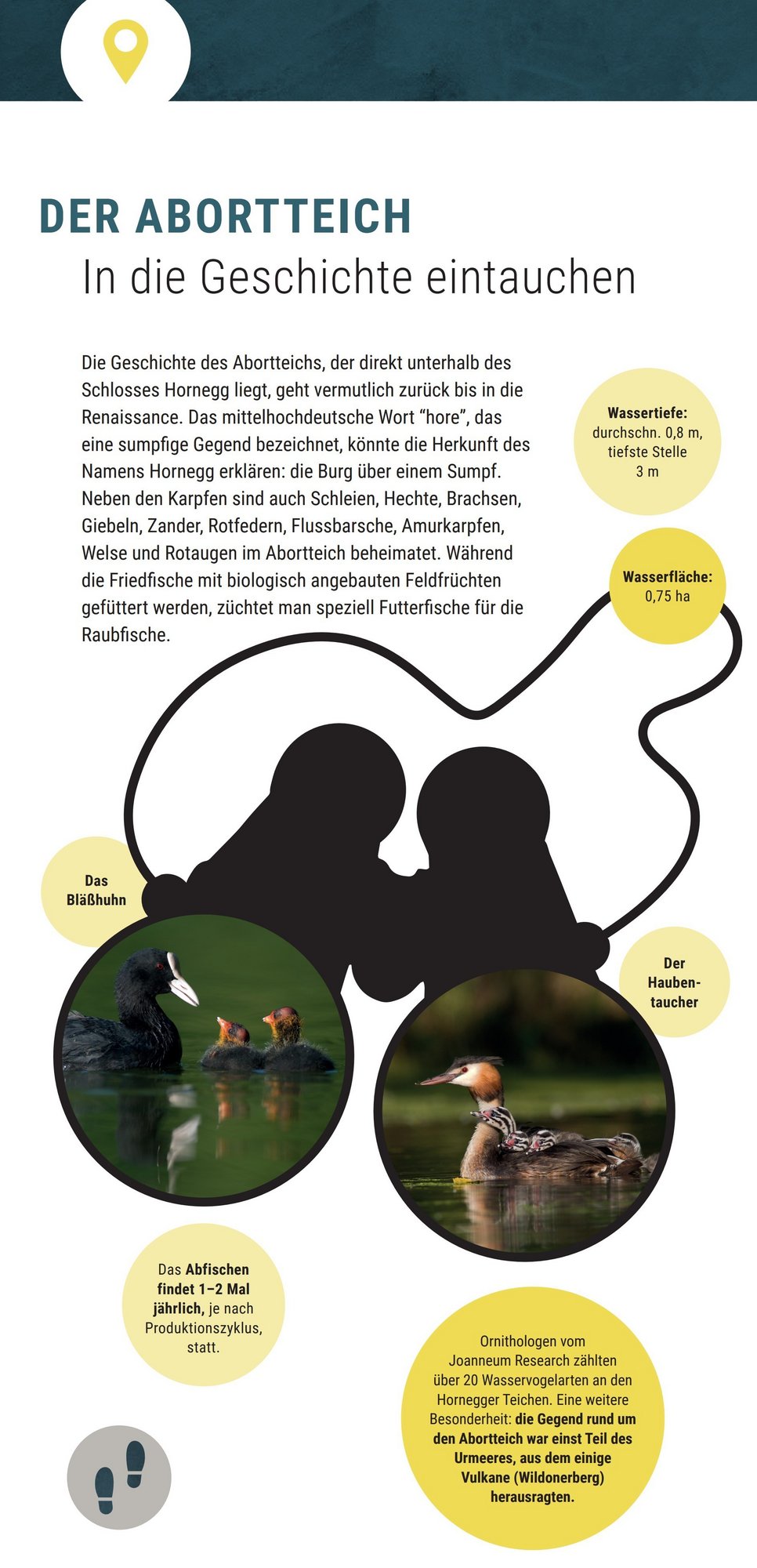 Die Geschichte des Abortteichs, der direkt unterhalb des Schlosses Hornegg liegt, geht vermutlich zurück bis in die Renaissance. Das mittelhochdeutsche Wort “hore”, das eine sumpfige Gegend bezeichnet, könnte die Herkunft des Namens Hornegg erklären: die Burg über einem Sumpf. Neben den Karpfen sind auch Schleien, Hechte, Brachsen, Giebeln, Zander, Rotfedern, Flussbarsche, Amurkarpfen, Welse und Rotaugen im Abortteich beheimatet. Während die Friedfische mit biologisch angebauten Feldfrüchten gefüttert werden, züchtet man speziell Futterfische für die Raubfische.