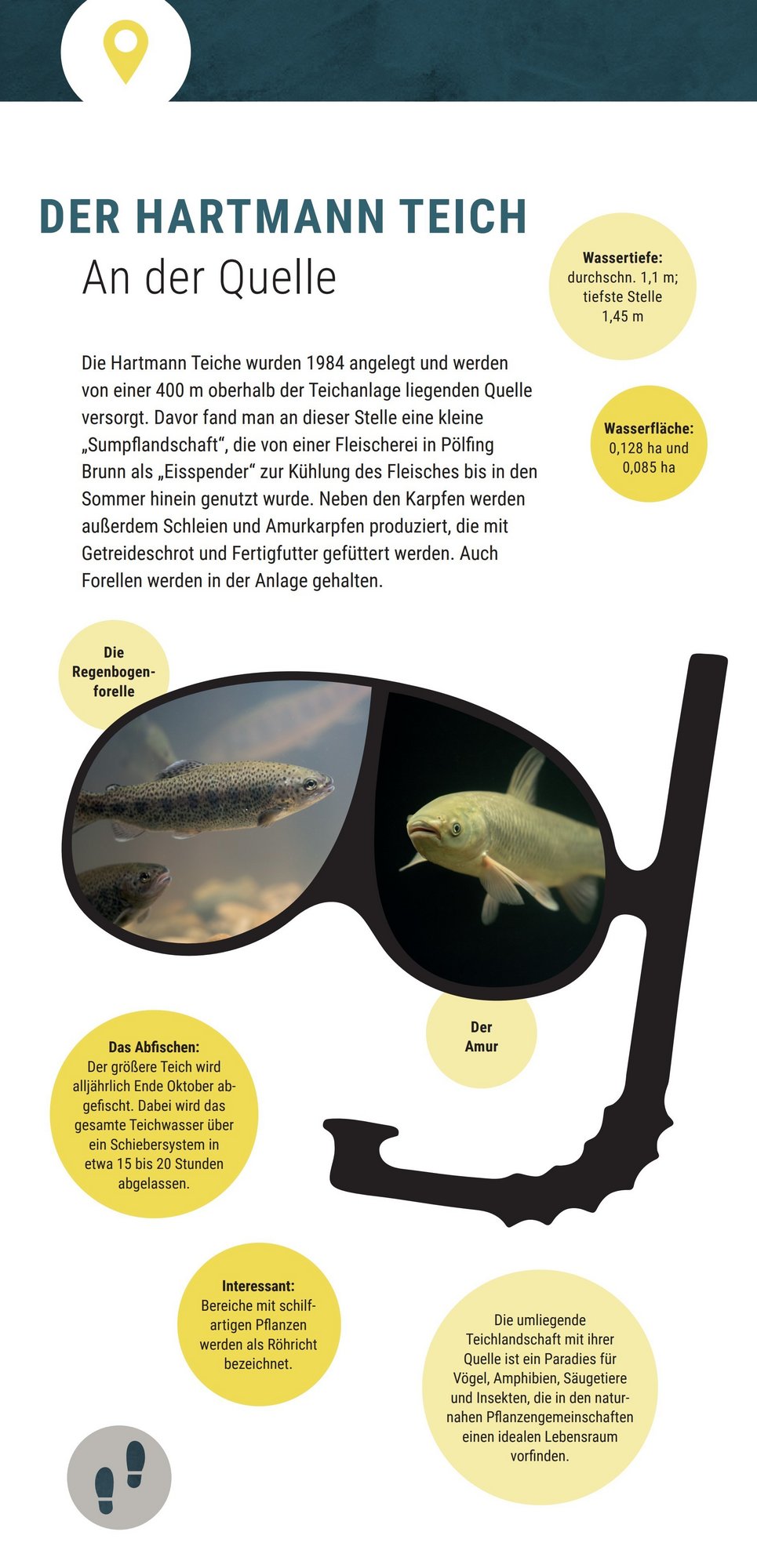 Die Hartmann Teiche wurden 1984 angelegt und werden von einer 400 m oberhalb der Teichanlage liegenden Quelle versorgt. Davor fand man an dieser Stelle eine kleine „Sumpflandschaft“, die von einer Fleischerei in Pölfing Brunn als „Eisspender“ zur Kühlung des Fleisches bis in den Sommer hinein genutzt wurde. Neben den Karpfen werden außerdem Schleien und Amurkarpfen produziert, die mit Getreideschrot und Fertigfutter gefüttert werden. Auch Forellen werden in der Anlage gehalten.