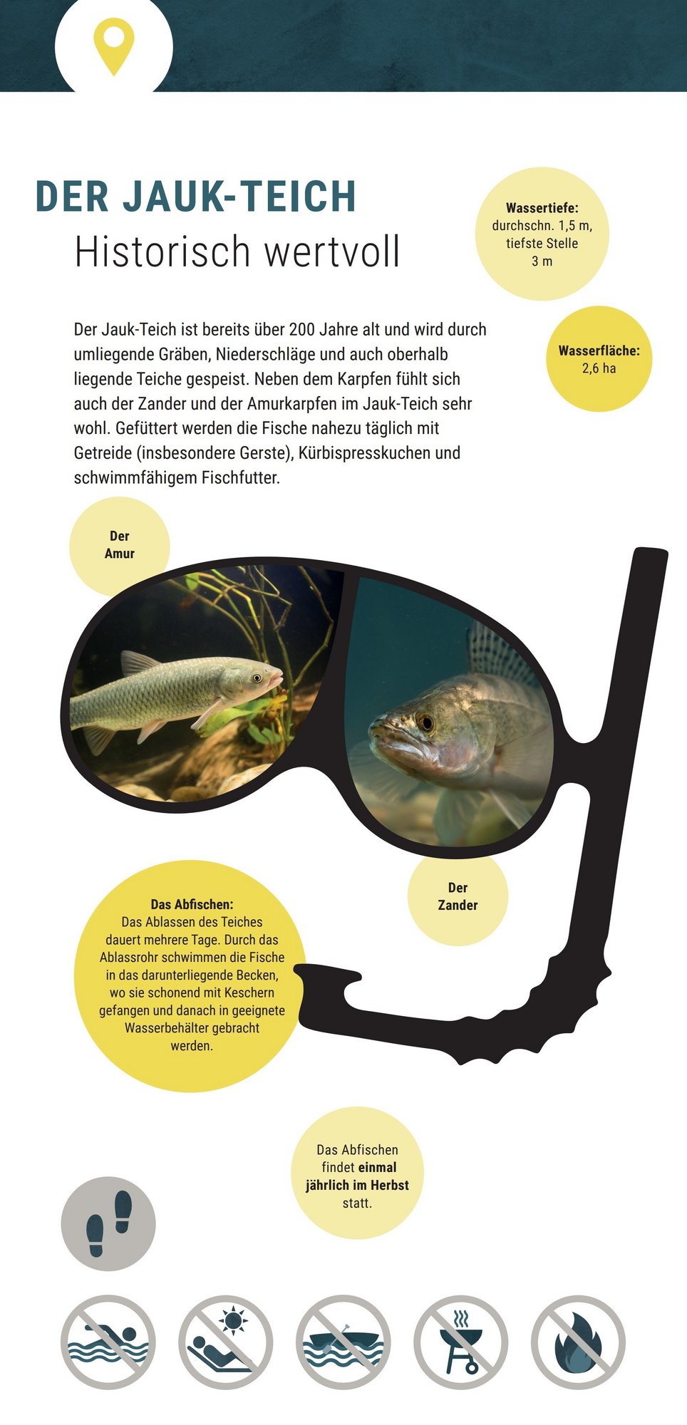 Der Jauk-Teich ist bereits über 200 Jahre alt und wird durch umliegende Gräben, Niederschläge und auch oberhalb liegende Teiche gespeist. Neben dem Karpfen fühlt sich auch der Zander und der Amurkarpfen im Jauk-Teich sehr wohl. Gefüttert werden die Fische nahezu täglich mit Getreide (insbesondere Gerste), Kürbispresskuchen und schwimmfähigem Fischfutter.