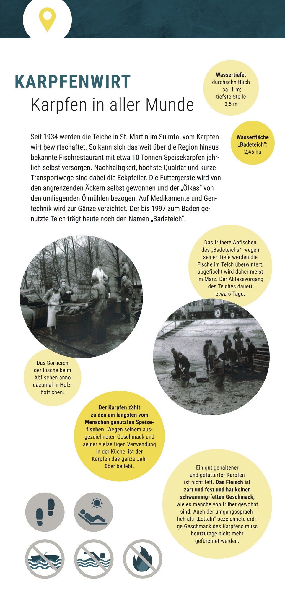 Seit 1934 werden die Teiche in St. Martin im Sulmtal vom Karpfenwirt bewirtschaftet. So kann sich das weit über die Region hinaus bekannte Fischrestaurant mit etwa 10 Tonnen Speisekarpfen jährlich selbst versorgen. Nachhaltigkeit, höchste Qualität und kurze Transportwege sind dabei die Eckpfeiler. Die Futtergerste wird von den angrenzenden Äckern selbst gewonnen und der „Ölkas“ von den umliegenden Ölmühlen bezogen. Auf Medikamente und Gentechnik wird zur Gänze verzichtet. Der bis 1997 zum Baden genutzte Teich trägt heute noch den Namen „Badeteich“.