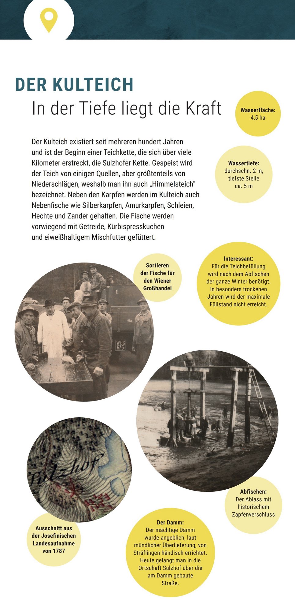 Der Kulteich existiert seit mehreren hundert Jahren und ist der Beginn einer Teichkette, die sich über viele Kilometer erstreckt, die Sulzhofer Kette. Gespeist wird der Teich von einigen Quellen, aber größtenteils von Niederschlägen, weshalb man ihn auch „Himmelsteich“ bezeichnet. Neben den Karpfen werden im Kulteich auch Nebenfische wie Silberkarpfen, Amurkarpfen, Schleien, Hechte und Zander gehalten. Die Fische werden vorwiegend mit Getreide, Kürbispresskuchen und eiweißhaltigem Mischfutter gefüttert.