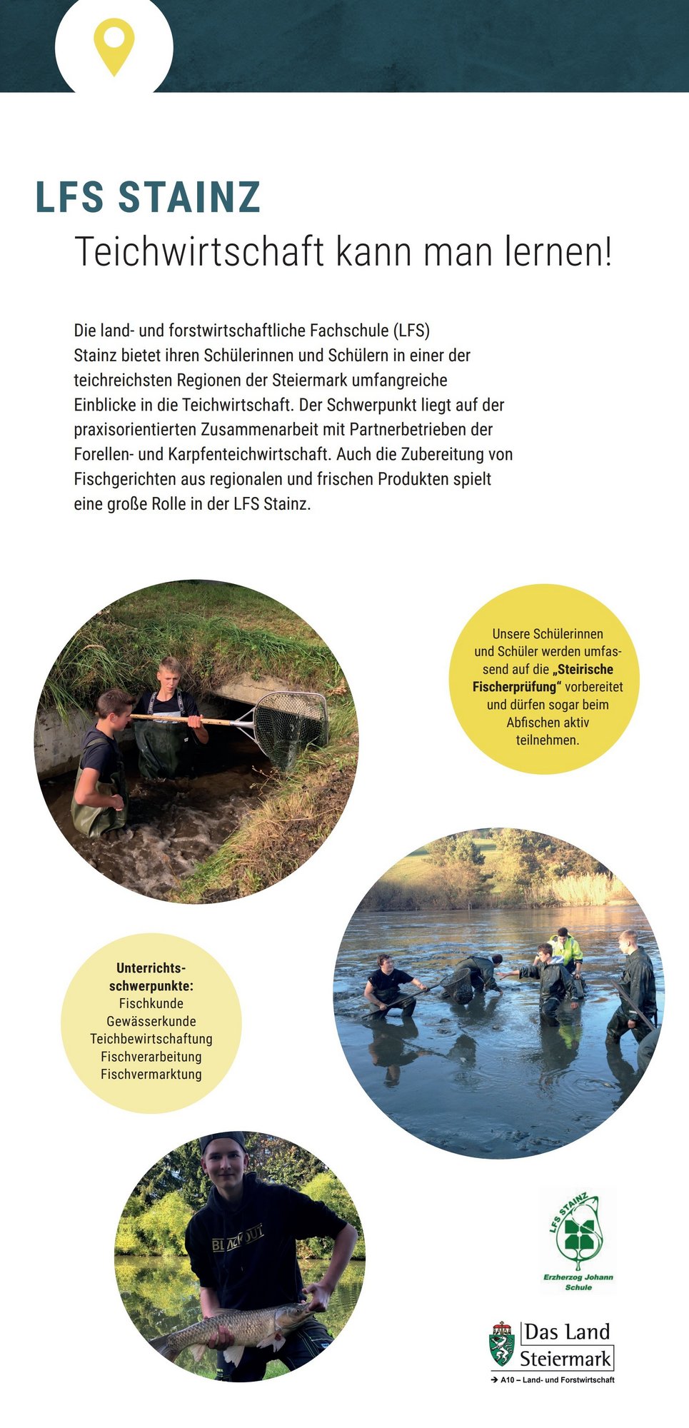 Die land- und forstwirtschaftliche Fachschule (LFS) Stainz bietet ihren Schülerinnen und Schülern in einer der teichreichsten Regionen der Steiermark umfangreiche Einblicke in die Teichwirtschaft. Der Schwerpunkt liegt auf der praxisorientierten Zusammenarbeit mit Partnerbetrieben der Forellen- und Karpfenteichwirtschaft. Auch die Zubereitung von Fischgerichten aus regionalen und frischen Produkten spielt eine große Rolle in der LFS Stainz.