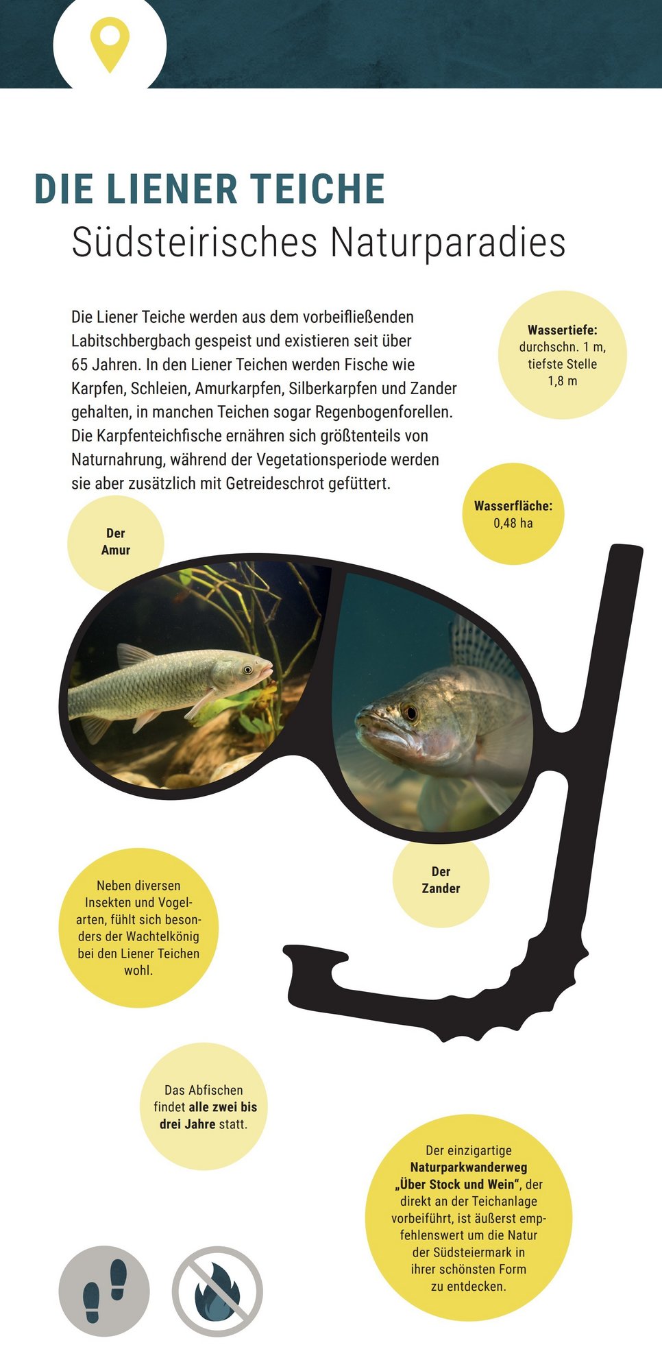 Die Liener Teiche werden aus dem vorbeifließenden Labitschbergbach gespeist und existieren seit über 65 Jahren. In den Liener Teichen werden Fische wie Karpfen, Schleien, Amurkarpfen, Silberkarpfen und Zander gehalten, in manchen Teichen sogar Regenbogenforellen. Die Karpfenteichfische ernähren sich größtenteils von Naturnahrung, während der Vegetationsperiode werden sie aber zusätzlich mit Getreideschrot gefüttert.