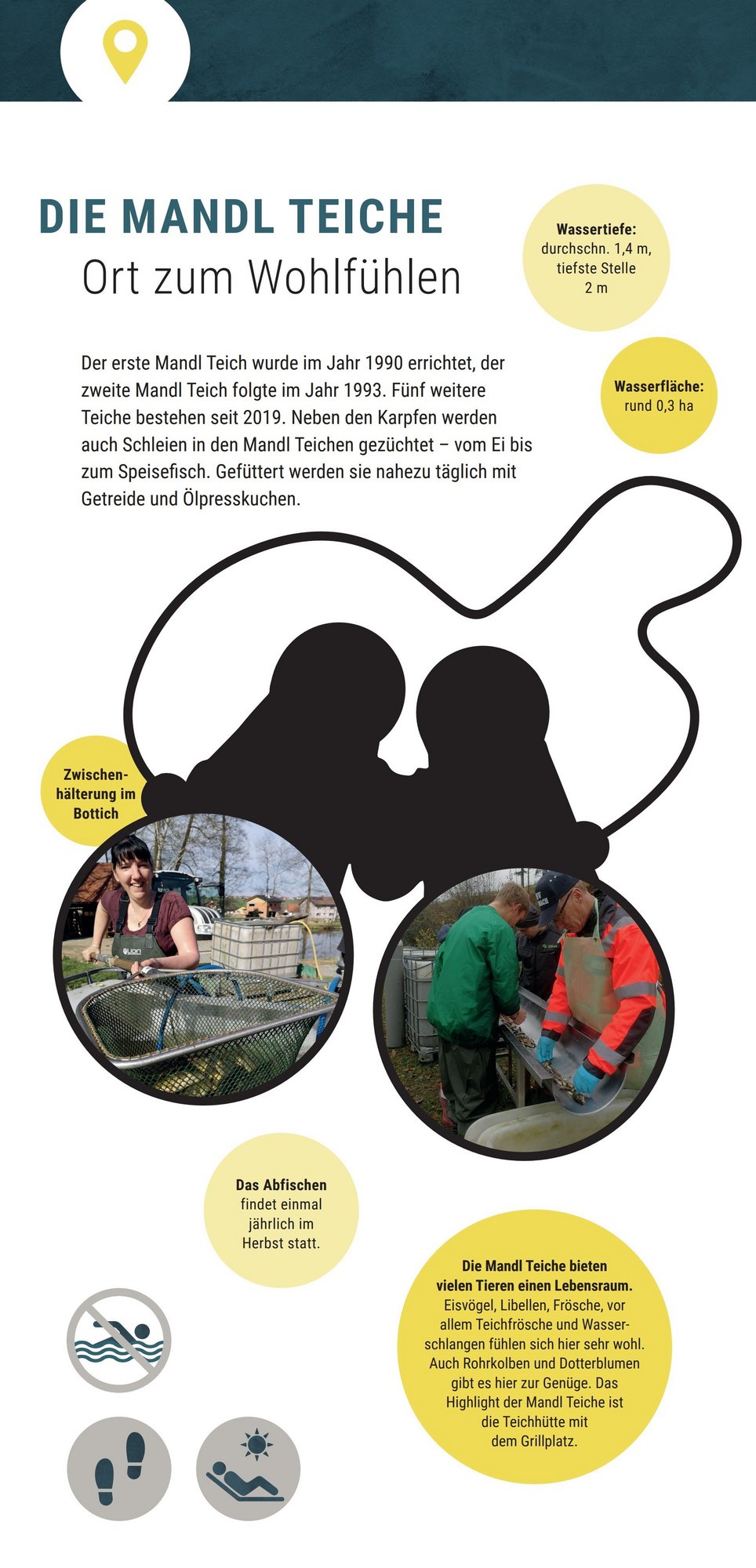 Der erste Mandl Teich wurde im Jahr 1990 errichtet, der zweite Mandl Teich folgte im Jahr 1993. Fünf weitere Teiche bestehen seit 2019. Neben den Karpfen werden auch Schleien in den Mandl Teichen gezüchtet – vom Ei bis zum Speisefisch. Gefüttert werden sie nahezu täglich mit Getreide und Ölpresskuchen.