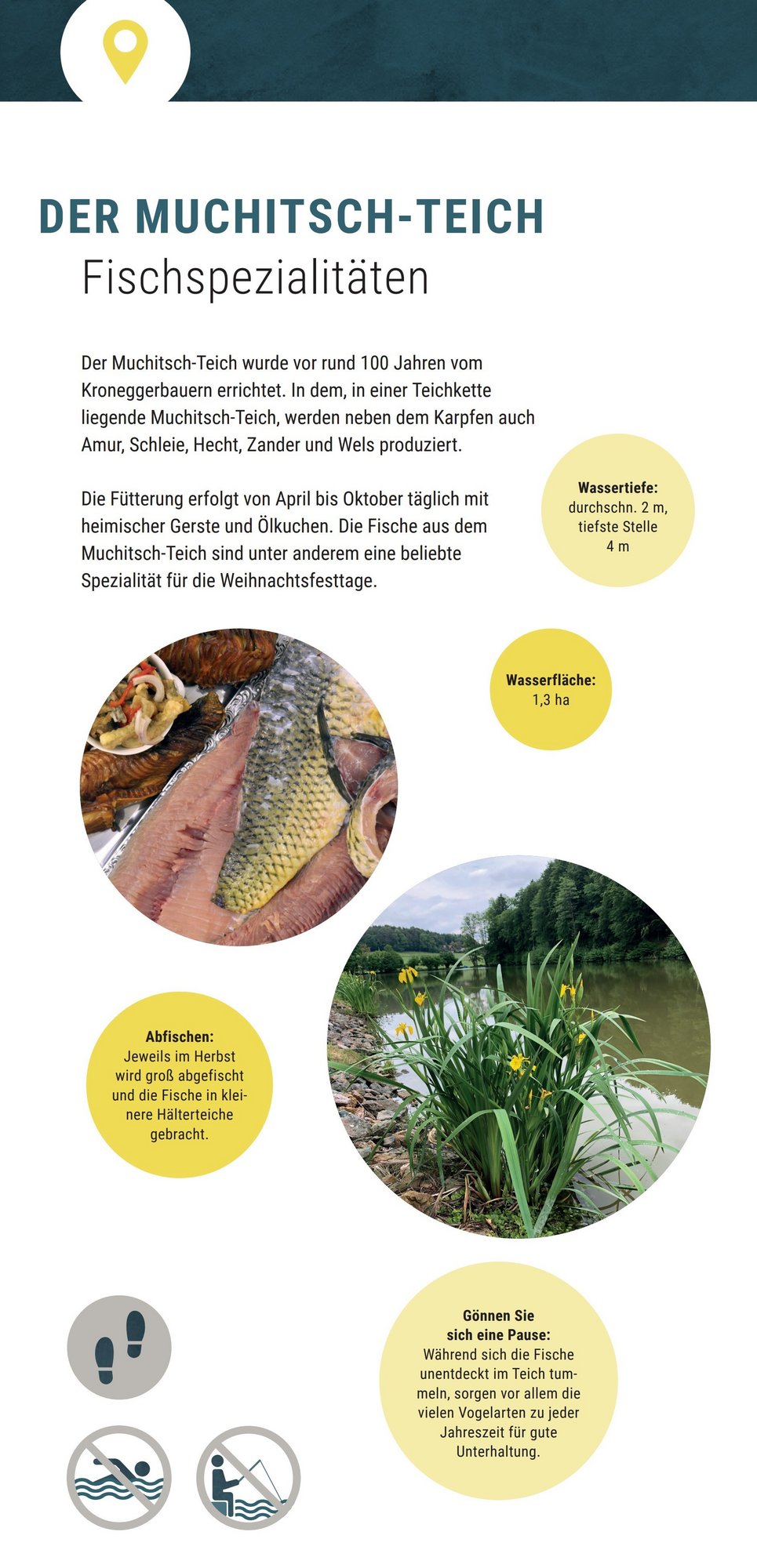 Der Muchitsch-Teich wurde vor rund 100 Jahren vom Kroneggerbauern errichtet. In dem, in einer Teichkette liegende Muchitsch-Teich, werden neben dem Karpfen auch Amur, Schleie, Hecht, Zander und Wels produziert. Die Fütterung erfolgt von April bis Oktober täglich mit heimischer Gerste und Ölkuchen. Die Fische aus dem Muchitsch-Teich sind unter anderem eine beliebte Spezialität für die Weihnachtsfesttage.