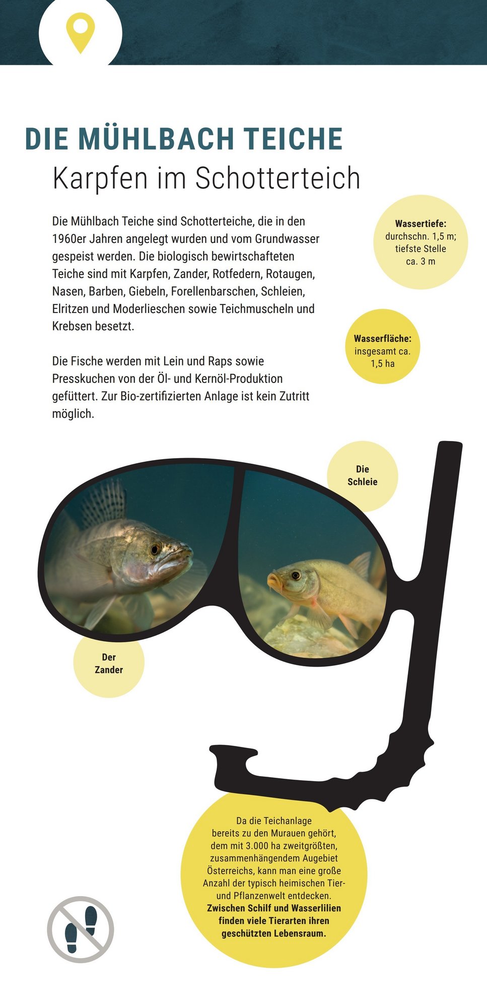 Die Mühlbach Teiche sind Schotterteiche, die in den 1960er Jahren angelegt wurden und vom Grundwasser gespeist werden. Die biologisch bewirtschafteten Teiche sind mit Karpfen, Zander, Rotfedern, Rotaugen, Nasen, Barben, Giebeln, Forellenbarschen, Schleien, Elritzen und Moderlieschen sowie Teichmuscheln und Krebsen besetzt. Die Fische werden mit Lein und Raps sowie Presskuchen von der Öl- und Kernöl-Produktion gefüttert. Zur Bio-zertifizierten Anlage ist kein Zutritt möglich.
