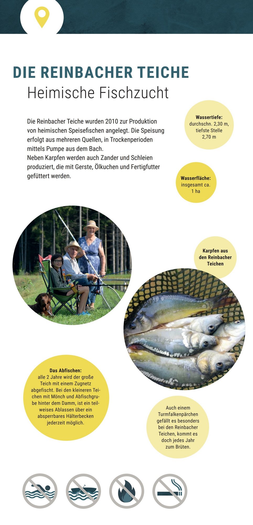 Die Reinbacher Teiche wurden 2010 zur Produktion von heimischen Speisefischen angelegt. Die Speisung erfolgt aus mehreren Quellen, in Trockenperioden mittels Pumpe aus dem Bach.