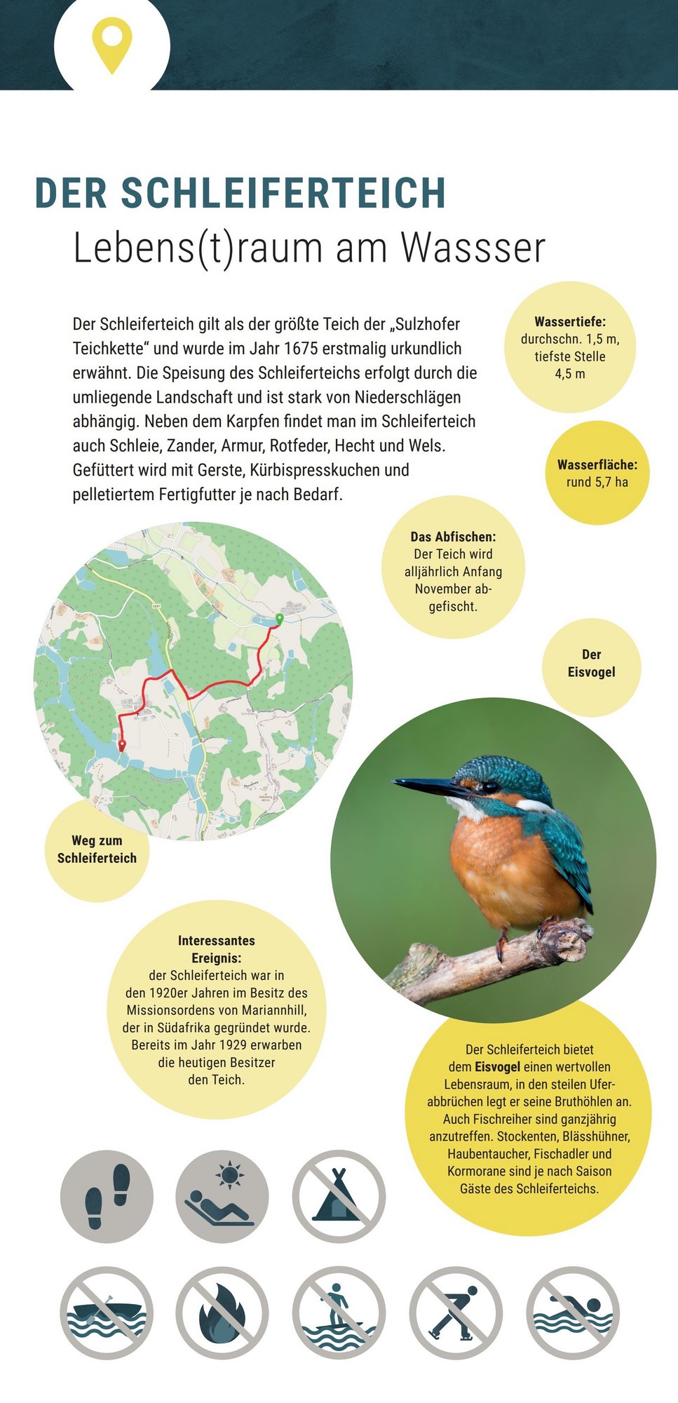 Der Schleiferteich gilt als der größte Teich der „Sulzhofer Teichkette“ und wurde im Jahr 1675 erstmalig urkundlich erwähnt. Die Speisung des Schleiferteichs erfolgt durch die umliegende Landschaft und ist stark von Niederschlägen abhängig. Neben dem Karpfen findet man im Schleiferteich auch Schleie, Zander, Armur, Rotfeder, Hecht und Wels. Gefüttert wird mit Gerste, Kürbispresskuchen und pelletiertem Fertigfutter je nach Bedarf.