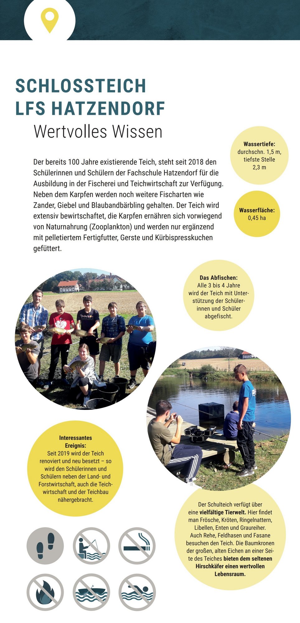 Der bereits 100 Jahre existierende Teich, steht seit 2018 den Schülerinnen und Schülern der Fachschule Hatzendorf für die Ausbildung in der Fischerei und Teichwirtschaft zur Verfügung. Neben dem Karpfen werden noch weitere Fischarten wie Zander, Giebel und Blaubandbärbling gehalten. Der Teich wird extensiv bewirtschaftet, die Karpfen ernähren sich vorwiegend von Naturnahrung (Zooplankton) und werden nur ergänzend mit pelletiertem Fertigfutter, Gerste und Kürbispresskuchen gefüttert.