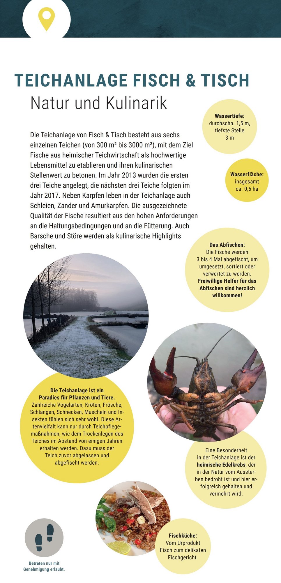 Die Teichanlage von Fisch & Tisch besteht aus sechs einzelnen Teichen (von 300 m² bis 3000 m²), mit dem Ziel Fische aus heimischer Teichwirtschaft als hochwertige Lebensmittel zu etablieren und ihren kulinarischen Stellenwert zu betonen. Im Jahr 2013 wurden die ersten drei Teiche angelegt, die nächsten drei Teiche folgten im Jahr 2017. Neben Karpfen leben in der Teichanlage auch Schleien, Zander und Amurkarpfen. Die ausgezeichnete Qualität der Fische resultiert aus den hohen Anforderungen an die Haltungsbedingungen und an die Fütterung. Auch Barsche und Störe werden als kulinarische Highlights gehalten.