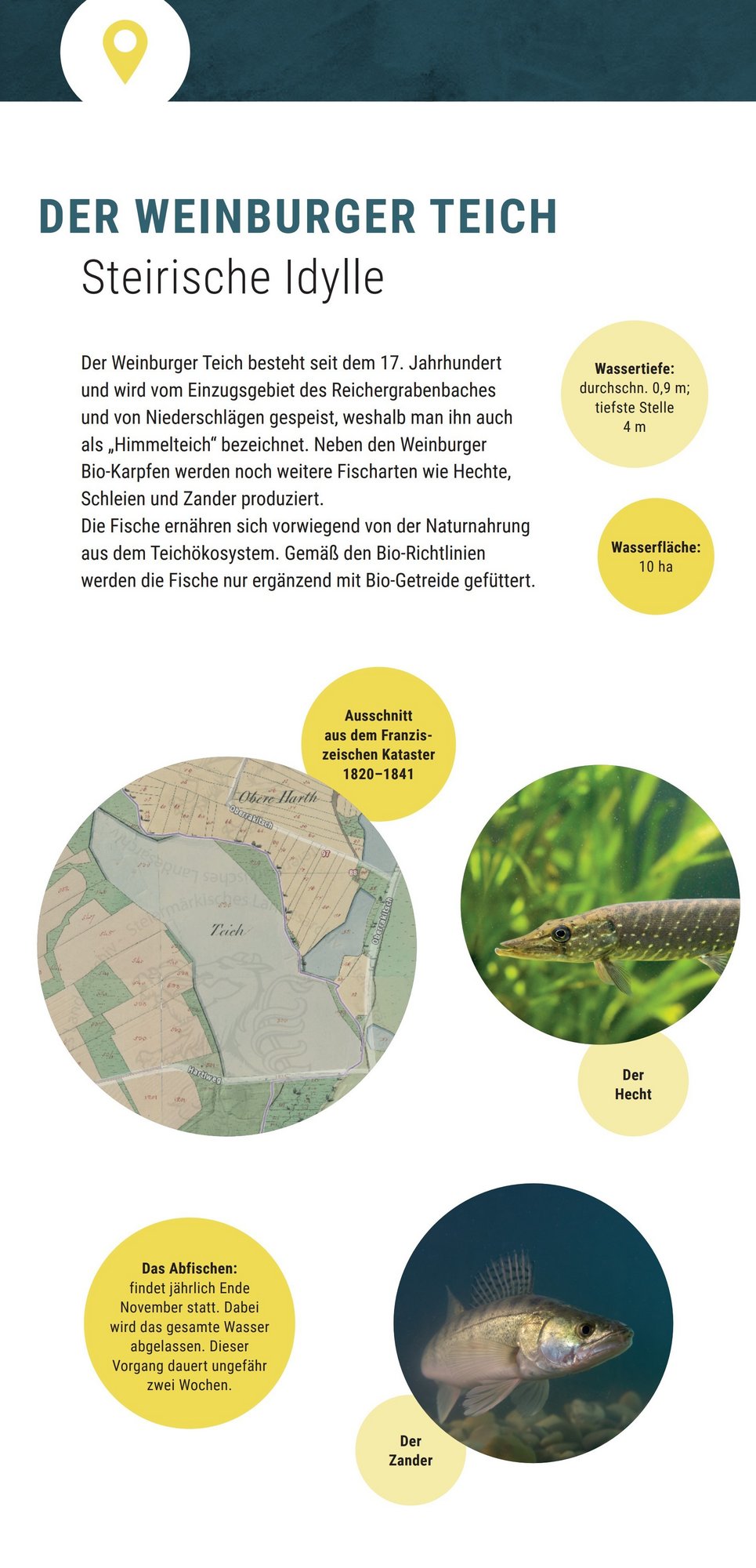Der Weinburger Teich besteht seit dem 17. Jahrhundert und wird vom Einzugsgebiet des Reichergrabenbaches und von Niederschlägen gespeist, weshalb man ihn auch als „Himmelteich“ bezeichnet. Neben den Weinburger Bio-Karpfen werden noch weitere Fischarten wie Hechte, Schleien und Zander produziert. Die Fische ernähren sich vorwiegend von der Naturnahrung aus dem Teichökosystem. Gemäß den Bio-Richtlinien werden die Fische nur ergänzend mit Bio-Getreide gefüttert.