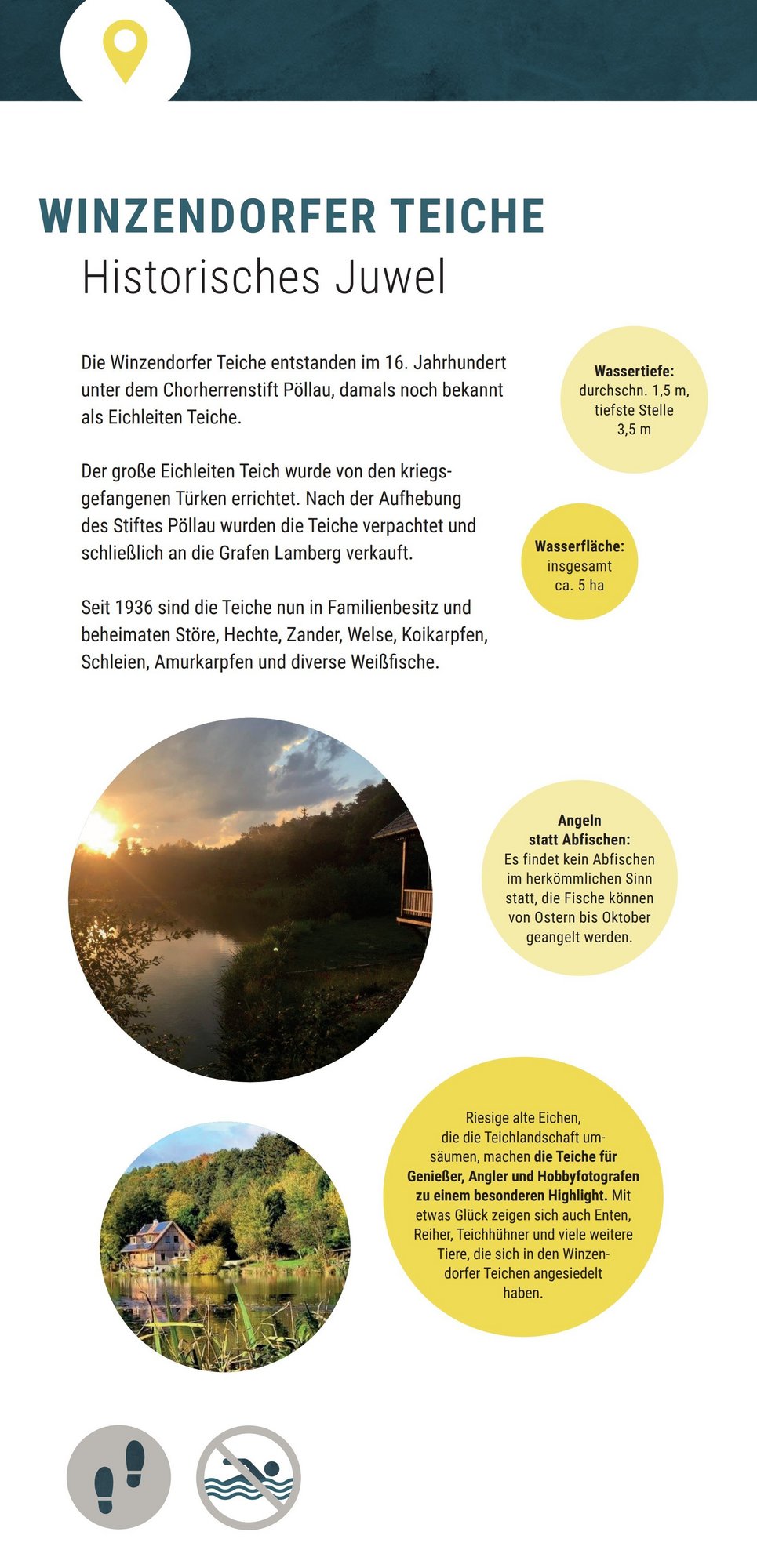 Die Winzendorfer Teiche entstanden im 16. Jahrhundert unter dem Chorherrenstift Pöllau, damals noch bekannt als Eichleiten Teiche. Der große Eichleiten Teich wurde von den kriegsgefangenen Türken errichtet. Nach der Aufhebung des Stiftes Pöllau wurden die Teiche verpachtet und schließlich an die Grafen Lamberg verkauft. Seit 1936 sind die Teiche nun in Familienbesitz und beheimaten Störe, Hechte, Zander, Welse, Koikarpfen, Schleien, Amurkarpfen und diverse Weißfische.